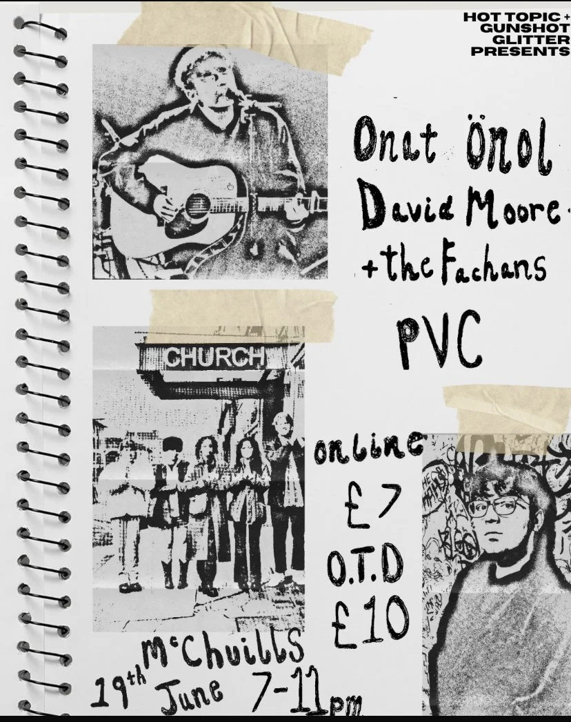 Gunshot Glitter and Hot Topic presents live music from Onat Önol, PVC + David Moore and The Fachans, live at McChuills on the 19th of June.
