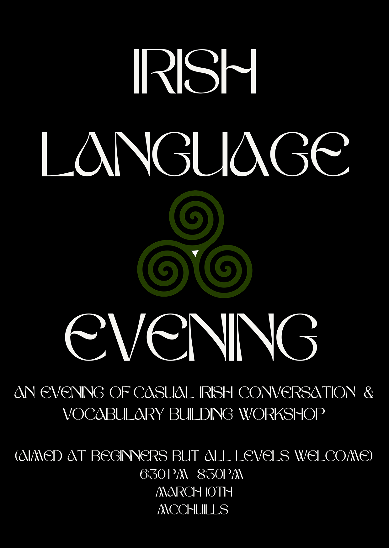 We are welcoming absolutely anyone with an interest in Irish (Gaeilge) to our first conversational evening & vocabulary workshop.